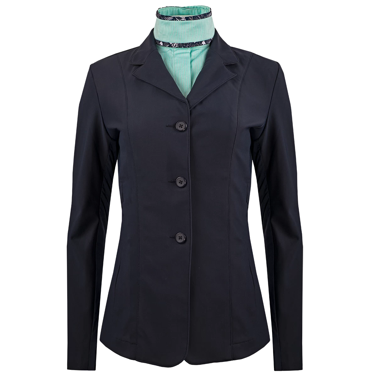 The Adriana Technical Ladies Hunt Coat was made with equestrians in mind with all day comfortable wear. The technical fabric features a stretch lining and back vents for breathability and comfort. Having five back seams for a feminine and soft look and a faux button front hiding an easy on and off zipper, this show coat is stunning and functional in the show ring.
