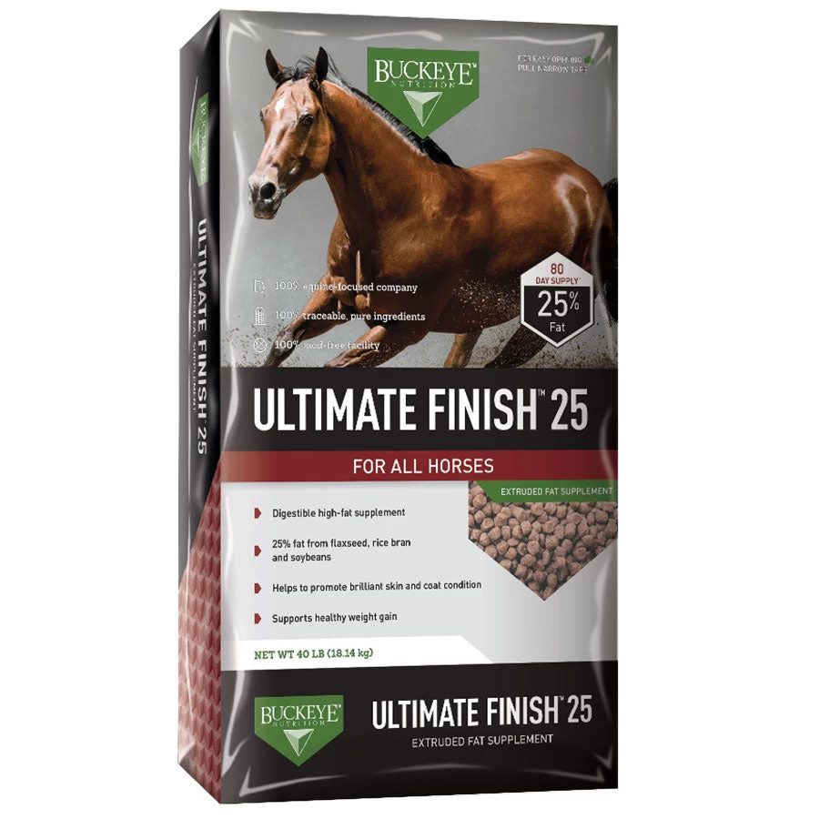 Ultimate Finish 25 by Buckeye Nutrition is a highly palatable, calorie dense extruded nugget specifically formulated to increase body condition, improve endurance, and produce a glossier coat. It easily provides additional calories for horses involved in competition, training, showing, conditioning and reproduction (gestating and lactating mares and breeding stallions).