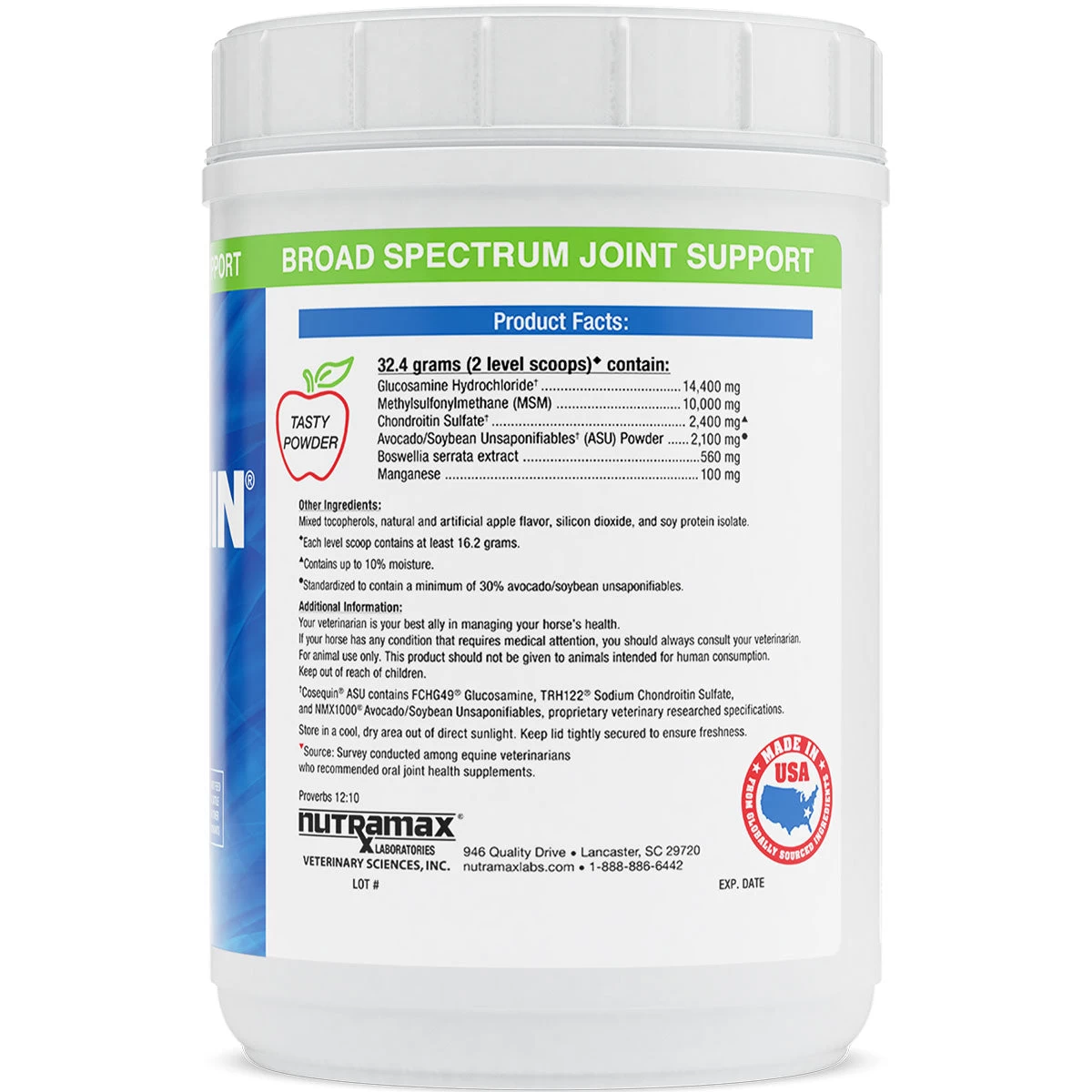 Cosequin ASU by Nutramax Labs goes above and beyond the traditional glucosamine/chondroitin sulfate products on the market. Cosequin ASU contains NMX1000 avocado/soybean unsaponifiables (ASU) formulated with FCHG49 glucosamine hydrochloride and TRH122 low molecular weight chondroitin sulfate plus the addition of high purity MSM! This sets Cosequin ASU apart from any other joint health supplement for horses. And all in a tasty, easy to administer powder!