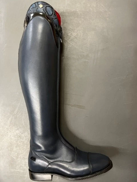 Polo style front zip. Oceana blue, WRAT leather (not stiff) with Dune top design. Spur rests. Size 39/MA/L (8-8 ½, 47 cm/18 ½” hgt, 37.5cm/14 ¾ “ calf) Outside hgt add 6 cm bow