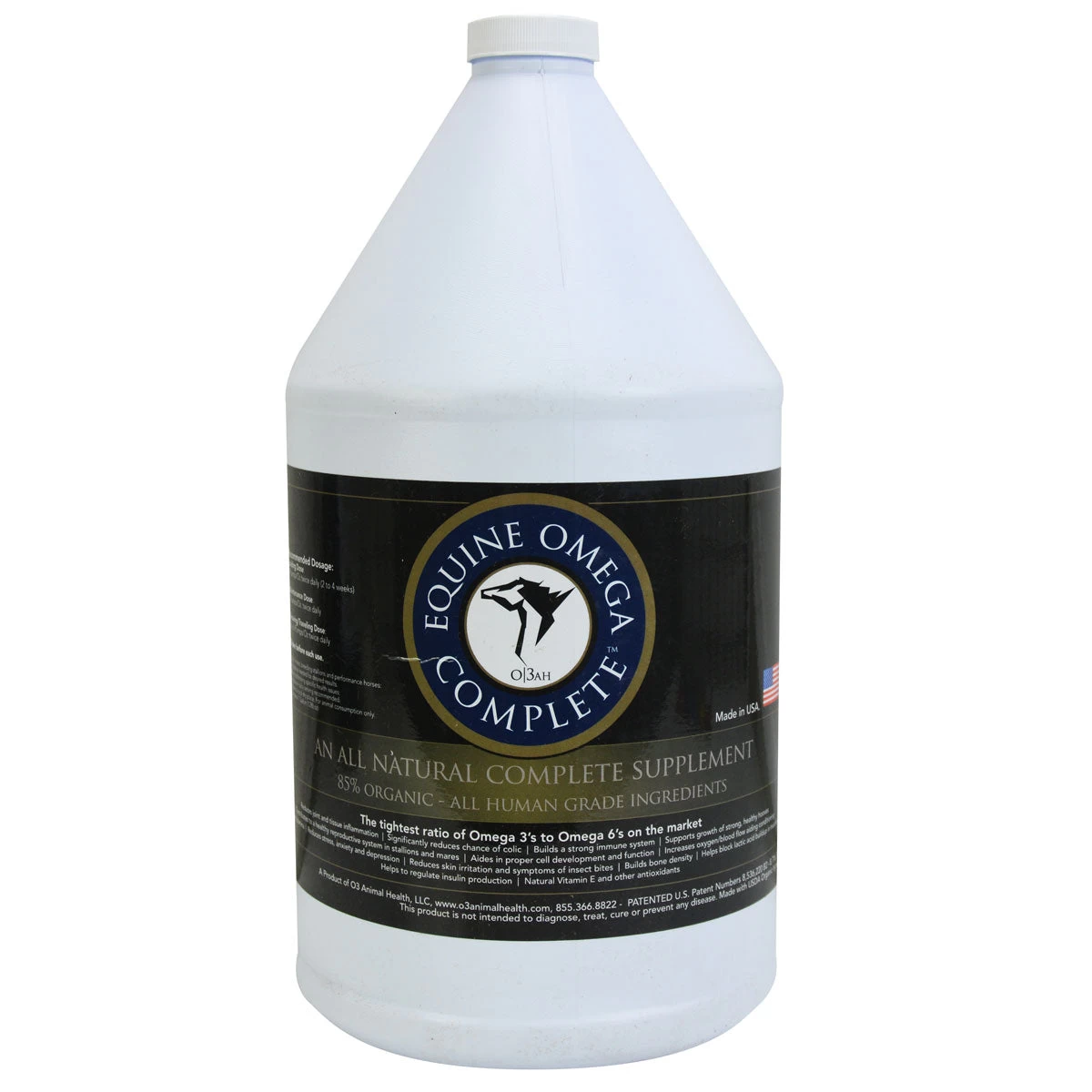 Equine Omega Complete by O3 Animal Health is a complete liquid supplement comprised and recommended by some of the top veterinarians, competitors, and other renowned professionals in the equine industry. With a full 360-degree coverage in this comprehensive supplement, Omega Complete supports many of the vital functions of the equine body system, eliminating the need for multiple supplements. Made of entirely human grade ingrediants and organically expelled soybean oil, a calucluated ratio of Omega 3’s and 6’s, it is also comprised of Vitamin E, Selenium, and other minerals for immune and antioxidant support.