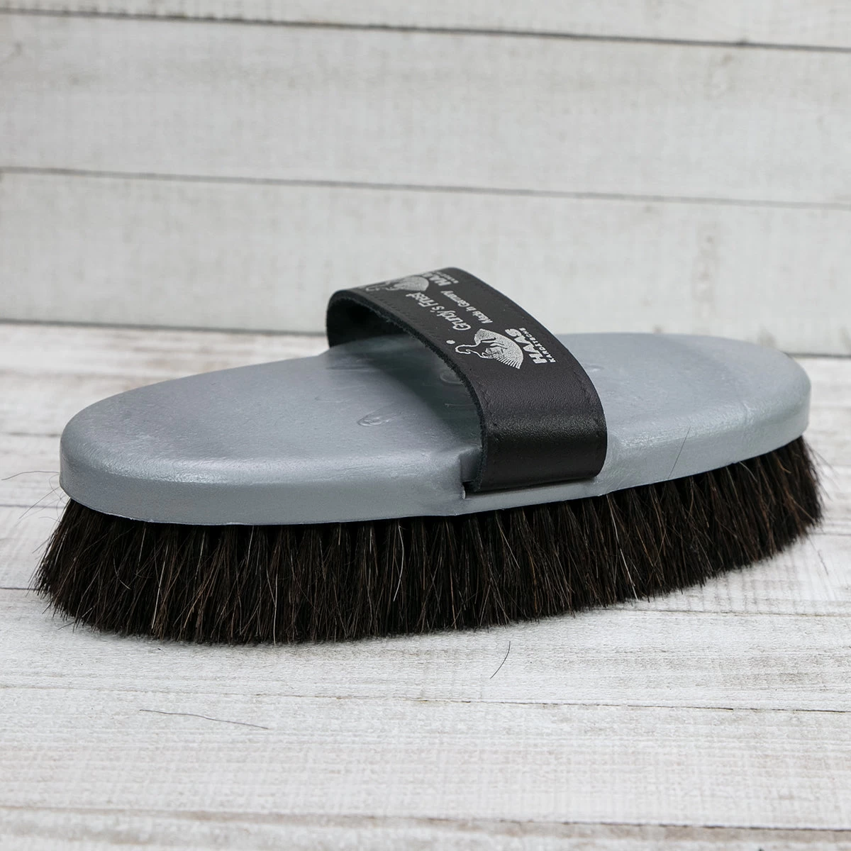 Haas Grundy’s Finest Brush is a super soft horse hair body brush with a comfortable leather handle that leaves the perfect shine. The synthetic back makes for a more hygienic and durable brush, while the leather handle adds a classic touch.