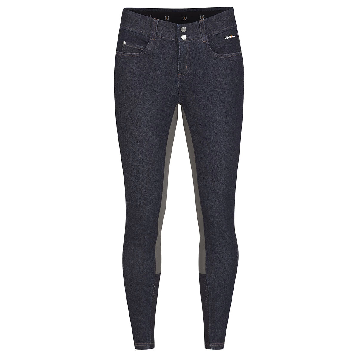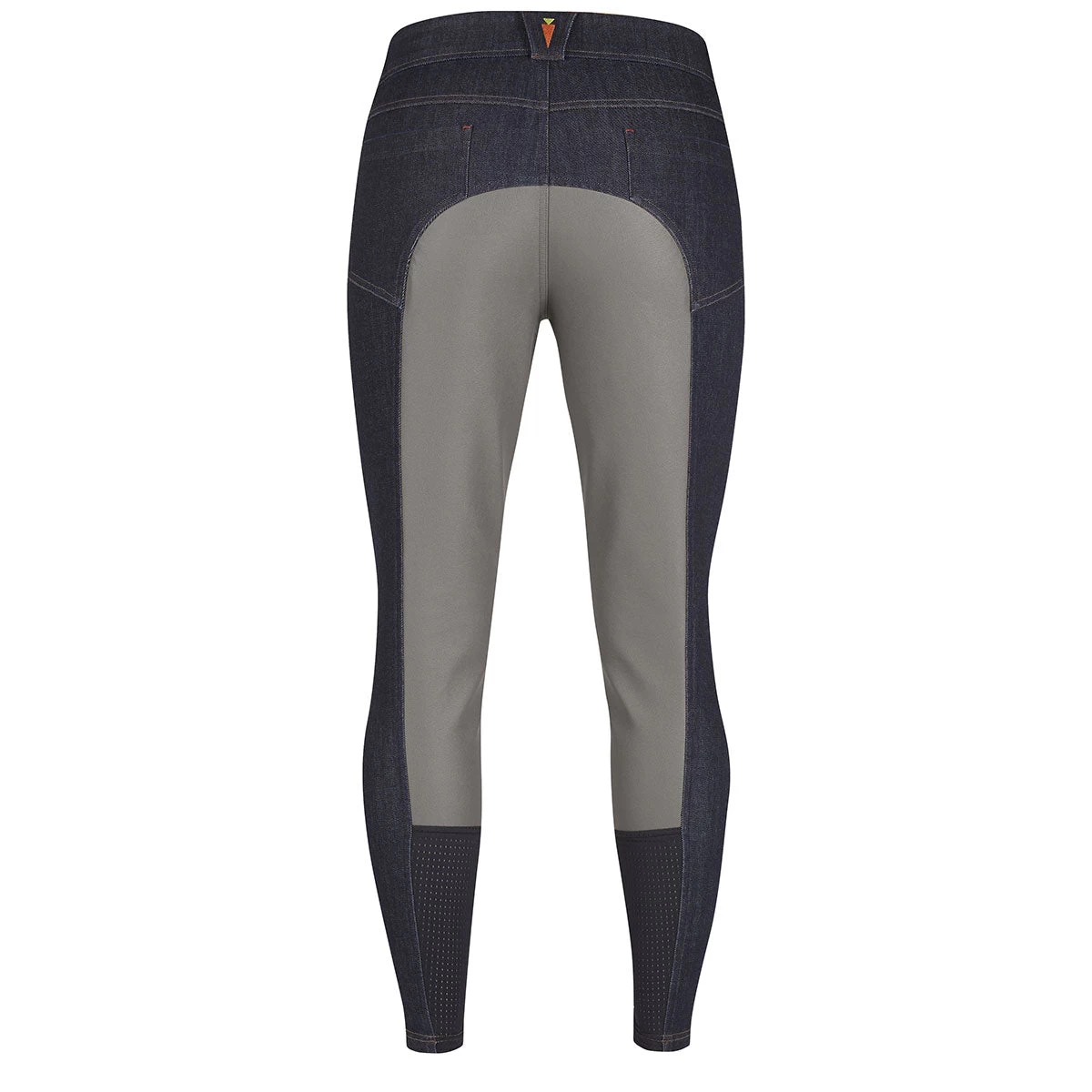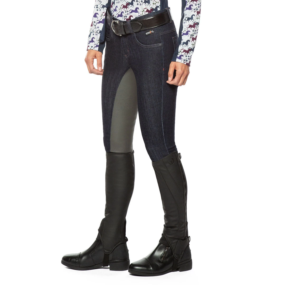 The Kerrits Stretch Denim Full Seat Ladies Breech takes everything you love about your favorite jeans and put them into your new favorite breech! Crafted from technical stretch denim infused with DriRelease technology, these breeches will pull perspiration away from the skin to the exterior of fabric so it can evaporate quickly instead of sticking to your legs. The contoured waistband will be equal parts comfort and pristine fit, combined with excellent stretch throughout the hip, thighs and legs, ensuring the shape and fit will remain the same – wash after wash. GripSoft patches move and flex with you from two point to sitting trot.