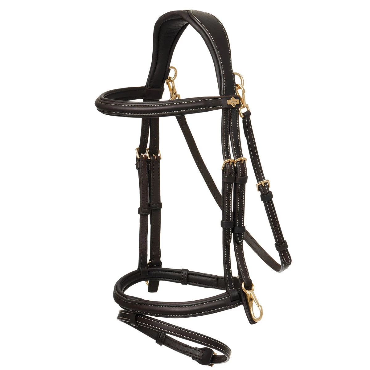 The LeMieux Work Bridle is a unique multipurpose design which offers premium features and styling at an affordable price point. The anatomically shaped crown piece, browband, and traditional noseband are all generously padded for the horse’s comfort. The throatlatch is completely detachable, and leather-backed clips at the bit offer the rider the ability to quickly change equipment based on the horse’s needs. LeMieux bridles are made from beautifully soft European leather and have matching reins (sold separately).