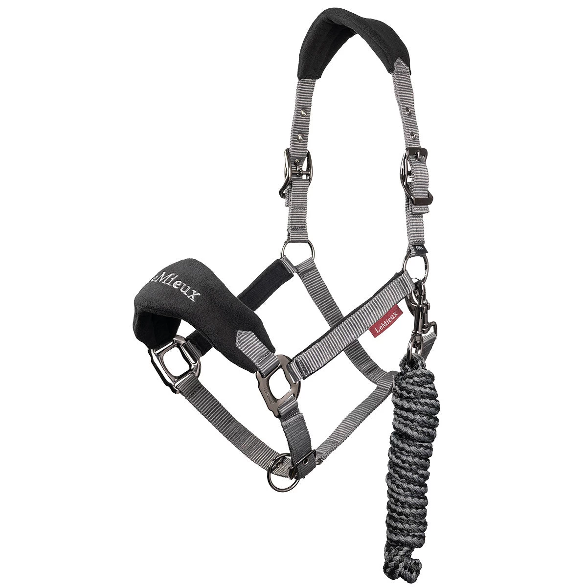 Vogue Halter and Leadrope set by LeMieux. Designed with fleece inserts on the poll and noseband plus fleece lined cheeks for comfort. Double adjustable crown pieces and adjustable chin. Ideal halter for travel, stable or turnout.
