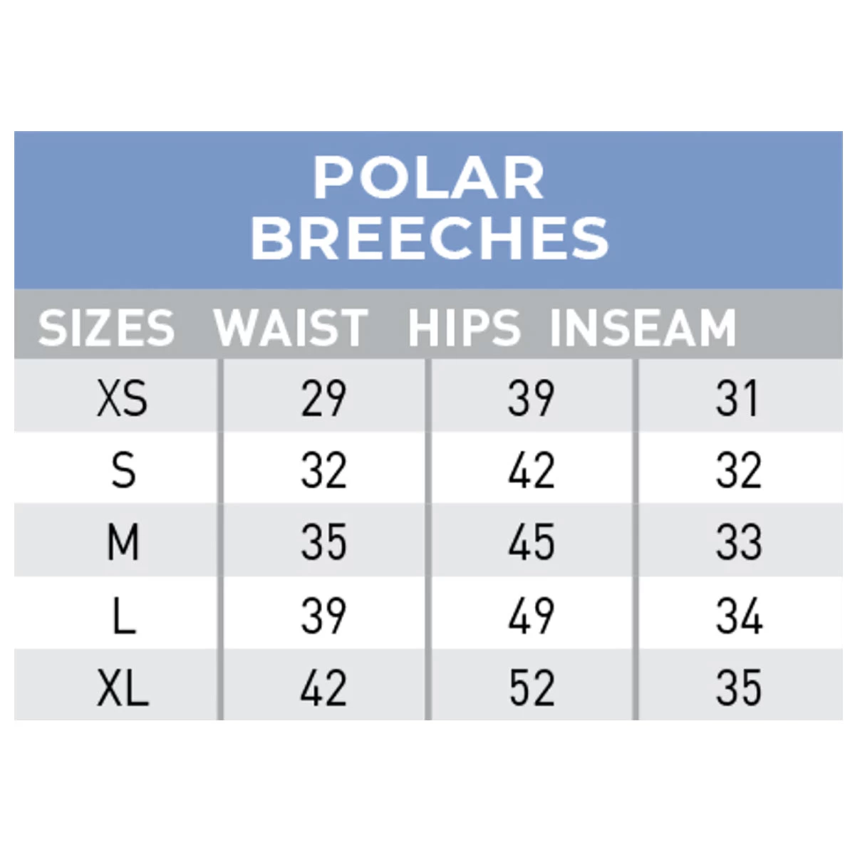The Mountain Horse Polar Unisex Breeches are the ultimate winter riding pants. Featuring breathable, windproof, and waterproof material. Reflective piping around the knees, a full length waterproof zipper at the side seams for full function. Ergonomically shaped knees and seat, reinforced imitation leather seat. You will stay warm all winter when you wear these breeches.