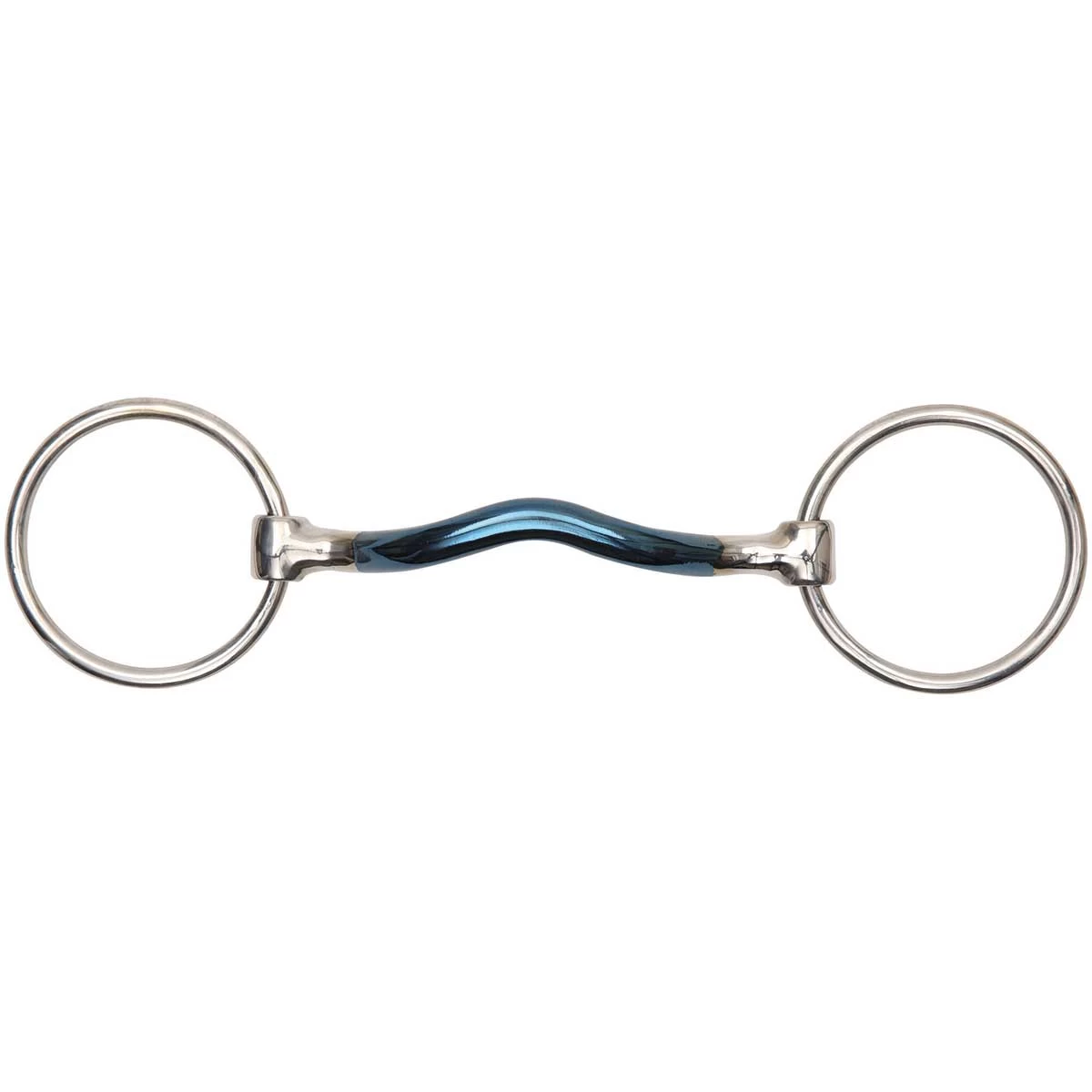 The mullen mouth bit allows for tongue relief without putting pressure in the poll of the mouth while maintaining even pressure across the tongue. A mullen is often used to encourage collection. Blue sweet iron creates a warm, sweet taste in the horse’s mouth to help with acceptance of the bit and to promote salivation. The blue color with fade over time, this is a natural process of blue sweet iron oxidization.