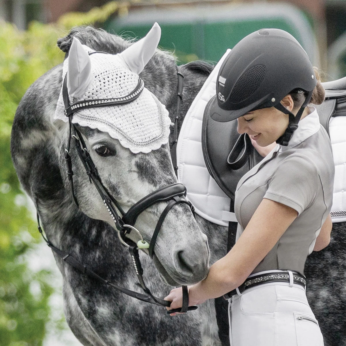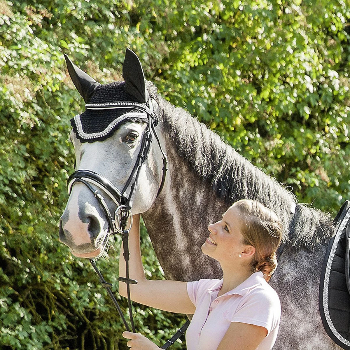 USG Baroness Fly Veil features double piping in silver that is highlighted by a single strand of crystals for that extra touch of elegance. Coordinate with the Baroness saddle pad to complete your horses show attire.