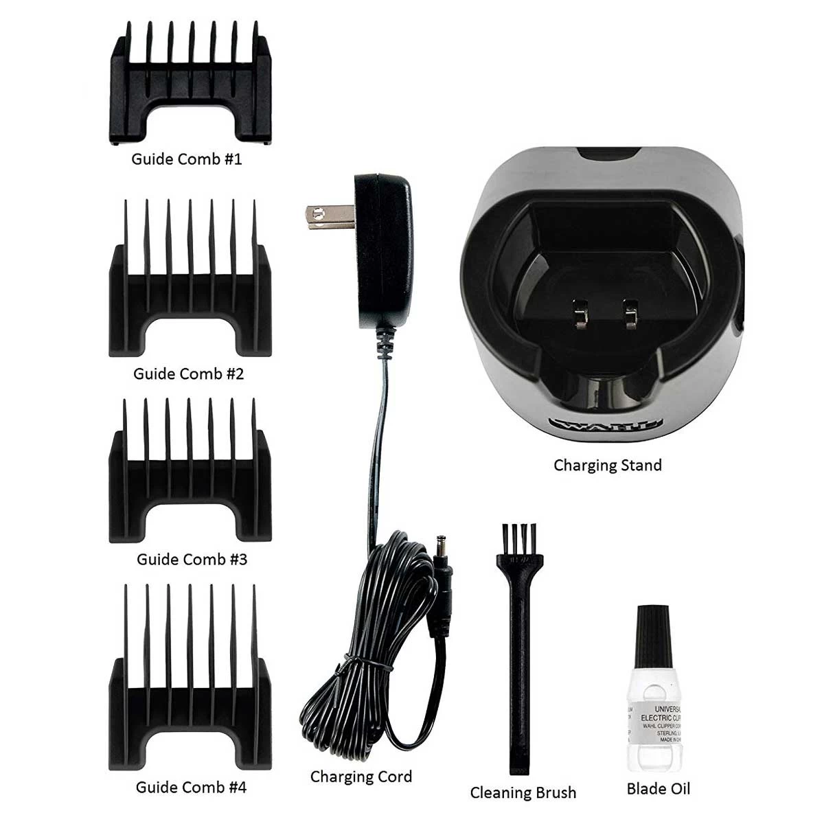 • Also includes: charge stand; 4 attachment guide combs (#1, #2, #3 & #4); cleaning brush; blade oil & instruction book