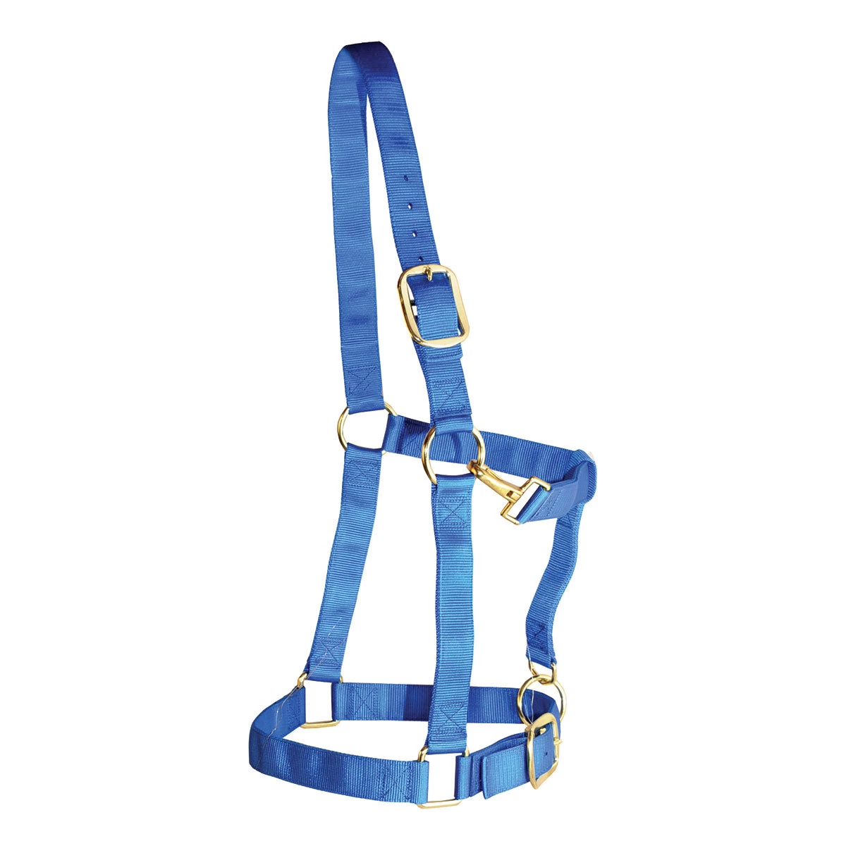 Basic adjustable chin and throat snap halter by Weaver. Economical nylon design with a flat throat and brass plated hardware (including sewn-in throat snap)